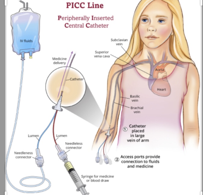 At this moment I have a Hickman central line in the left side of my chest. I have had this central line since July of 2019. Over the years I’ve had 3 Hickman lines. My Hickman is used for medication like Benadryl is one and it’s use for fluids, iron different vitamins and blood infusions or transfusions. I have had very many picc lie over the years. Mine normally lasted between 3-10 months. Mainly for iv medicines that I need daily like Benadryl. The picc lines are normally in your arms. But can be place on other parts of the body as well. A GJ tube is a tube that goes into your stomach from a hole created by the doctors that goes in your stomach wall and is guided with a wire past your stomach into your small intestines and stops at the jejunum which is a part of your small intestines. If all that was confusing you’re not alone. Basically the GJ tube is so that you can have a tube in your stomach and without having to have surgery to have another tube placed in your small intestines.